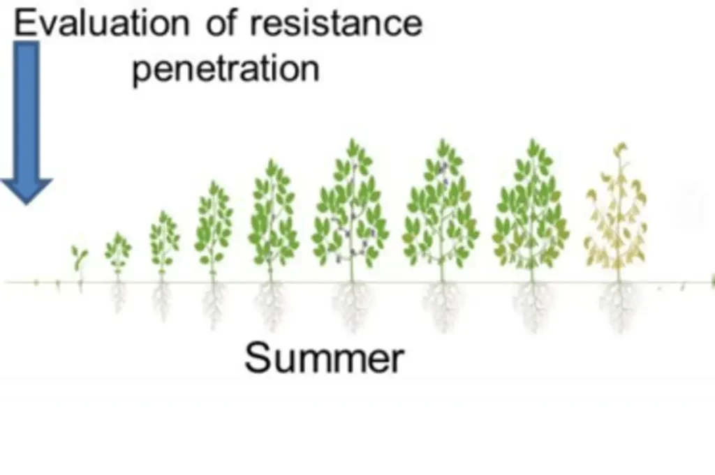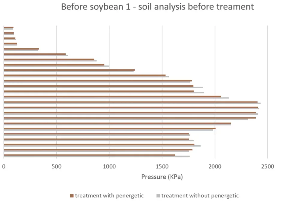 Bei der Behandlung mit Penergetic gab es eine signifikante Verringerung des Eindringwiderstandes in Tiefen von 11 bis 22 cm. In Tiefen von 14 bis 20 Zentimetern traten die größten Reduzierungen der Bodenverdichtung auf. Vor dem Anbau von Sojabohne 1 lag der Eindringwiderstand in diesen Tiefen bei fast 2400 KPa. Nach dem Anbau von Sojabohne 2 lag der Eindringwiderstand in diesen Tiefen bei weniger als 1900 KPa.