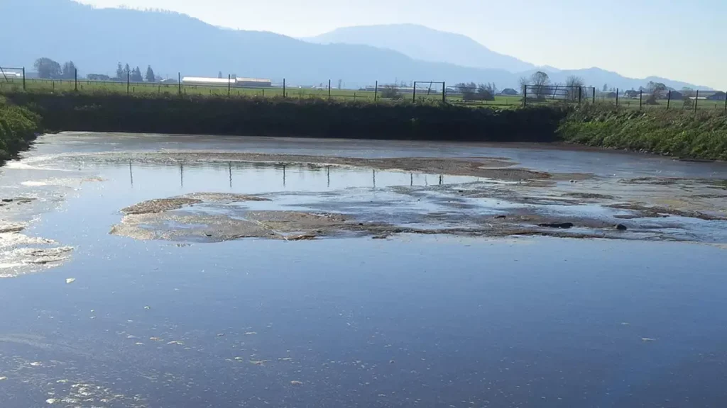 Durch die Verwendung von penergetic g löste sich die schwere Schwimmschicht auf der Oberfläche eines 300 Kuh-Gülleteichs in Kanada innert acht Wochen auf.