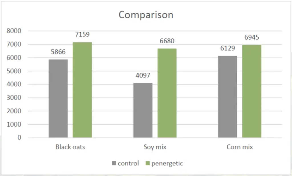 Die positive Wirkung von penergetic auf die verschiedenen Mischungen von Cover Crops bei diesem Versuch war signifikant (13-61% Steigerung des Ertrags).