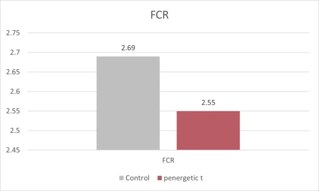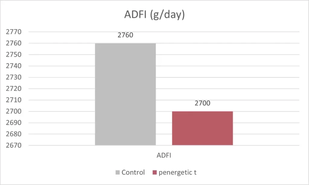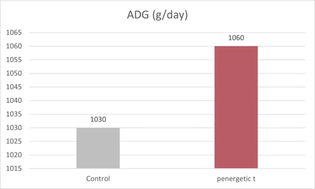 Die Zugabe von penergetic t zur Standard-Kiernan-Diät führte zu einem Anstieg der durchschnittlichen täglichen Zunahmen ( average daily gain= ADG) um +2,91 %, einer Verringerung der durchschnittlichen täglichen Futteraufnahme (Average daily feed intake = ADFI) um -2,17 %, einer besseren Futterverwertung (feed conversion rate = FCR) um +5,2 % und einem Anstieg des durchschnittlichen Verkaufsgewichts um +1,75 % (gewichtsbereinigt).