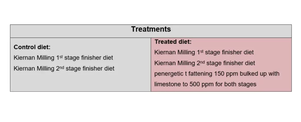 Die Futtermittel der Testgruppe für die 1. und 2. Stufe enthalten jeweils 150 g penergetic t pro Tonne des Fertigfutters. Da die Dosierung von penergetic t für die Futtermühle zu niedrig war, wurde es mit 350 g Kalkstein in Futtermittelqualität aufgestockt, um eine endgültige Einmischungsrate von 500 ppm zu erreichen.
